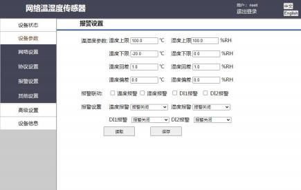 用戶在該頁面可以設(shè)置溫度、濕度上下限報警閾值、報警回差值,用戶可以自由選擇是否開啟報警以及報警觸發(fā)條件,同時在該頁面用戶可以選擇報警是否需要聯(lián)動繼電器,如果選擇聯(lián)動,那么報警觸發(fā)時,繼電器將會工作。