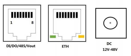 設(shè)備下方有3個接口: DI/ DO/485/Vout 接口、ETH 網(wǎng)絡(luò)通訊接口、DC12V-48V。
