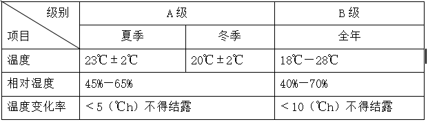 機房設備開機時和停機時對室內(nèi)溫度和濕度的要求見表一和表二。