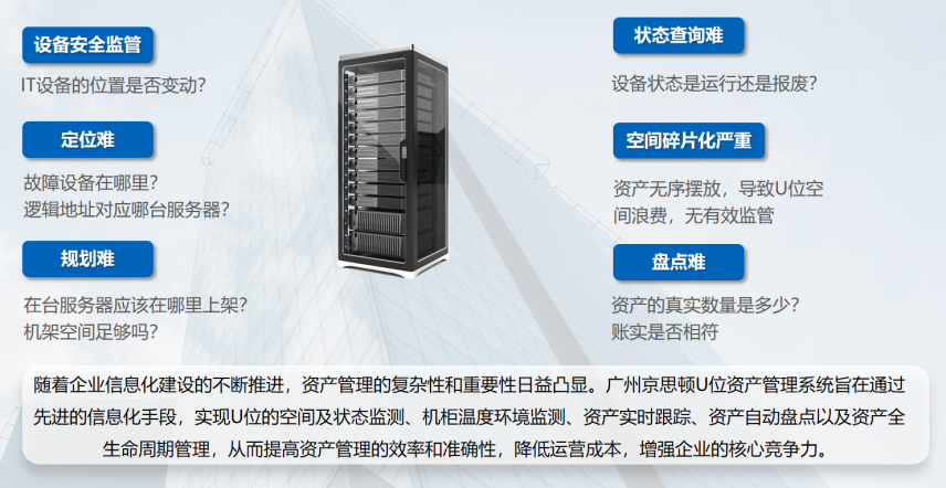 廣州斯必得U位資產(chǎn)管理系統(tǒng)通過先進(jìn)的技術(shù)手段和管理理念,實(shí)現(xiàn)了對U位空間和狀態(tài)、機(jī)柜溫度環(huán)境、資產(chǎn)實(shí)時跟蹤、自動盤點(diǎn)以及全生命周期的全面管理。該系統(tǒng)的實(shí)施將有效提升企業(yè)的資產(chǎn)管理水平,降低運(yùn)營成本,增強(qiáng)企業(yè)的競爭力。
